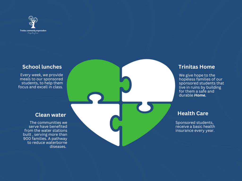 Health insurance for vulnerable children and families, Emergency medical care and interventions, Weekly school lunches for all sponsored students, Access to clean water and sanitation, Education on hygiene, nutrition, and disease prevention, Safe shelter through our Trinitas Homes, built for families living in extreme poverty.